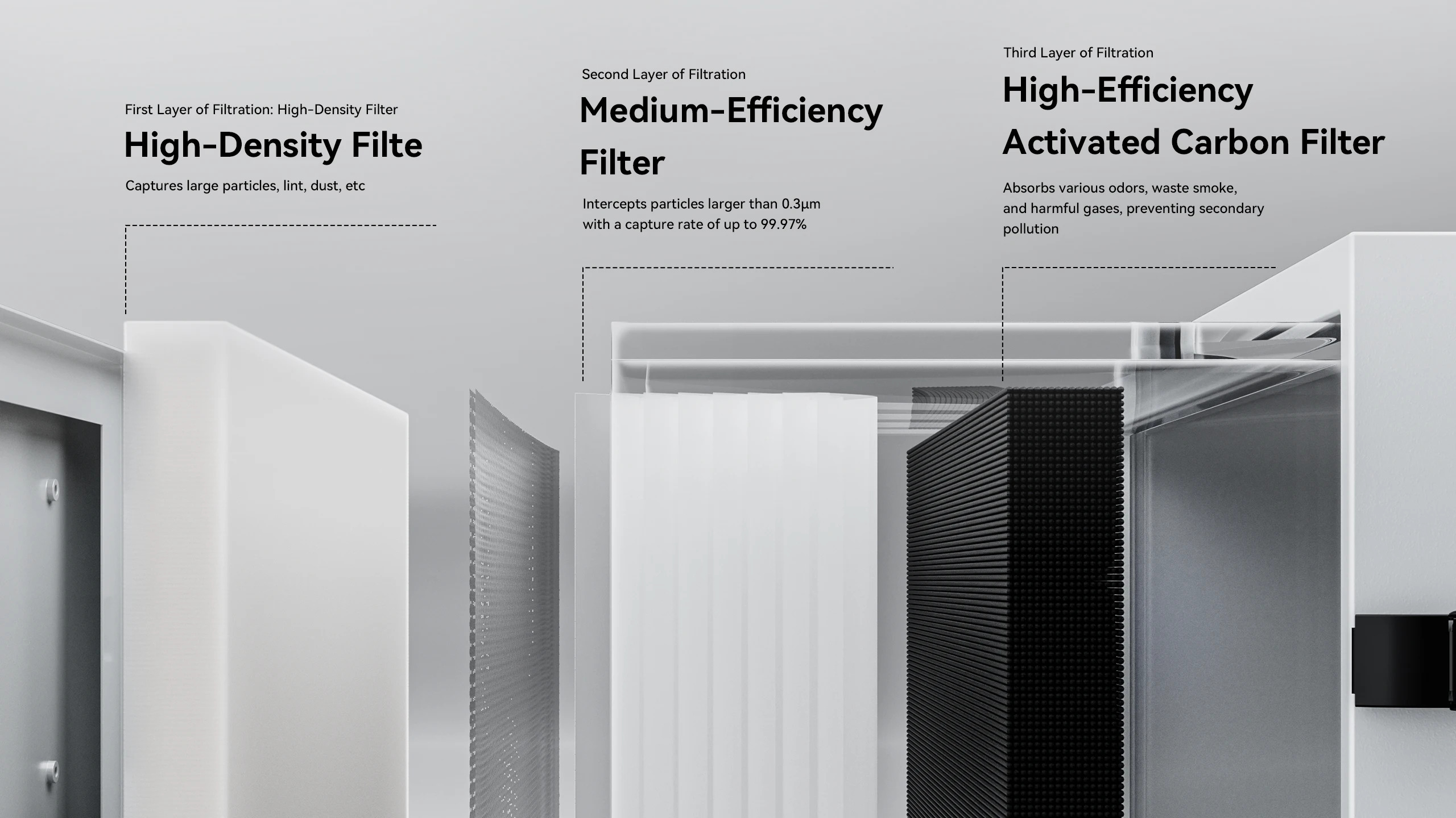 Χρησιμοποιεί ένα συμπαγές στοιχείο HEPA H13 και ένα παχύ στρώμα ενεργού άνθρακα για την εξάλειψη της λεπτής σκόνης (PM2.5/PM10), του ερεθιστικού καπνού και των επικίνδυνων πτητικών οργανικών ενώσεων (TVOC, φορμαλδεΰδη).