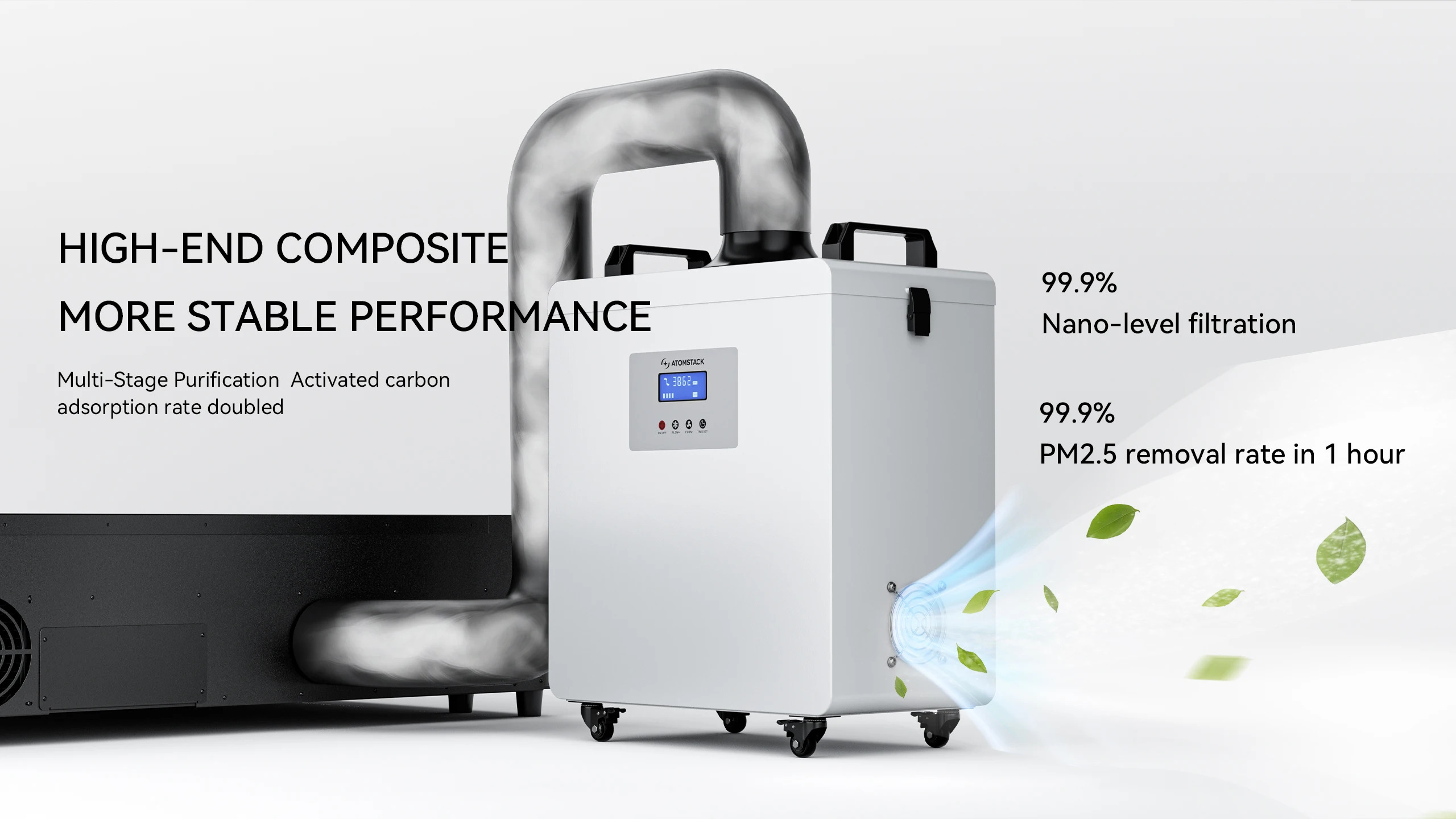 Εξασφαλίστε απόλυτη ασφάλεια με το AtomStack D4. Αυτός ο απορροφητής καπνού προσφέρει απόδοση φιλτραρίσματος 99,97%. Σε αντίθεση με τις φθηνές οικονομικές λύσεις, το μοντέλο D4 είναι εξοπλισμένο με έναν ισχυρό κινητήρα χωρίς ψήκτρες (5200 RPM), ο οποίος εγγυάται βιομηχανική ροή αέρα έως και 22,5 m/s, λειτουργώντας παράλληλα εξαιρετικά αθόρυβα.