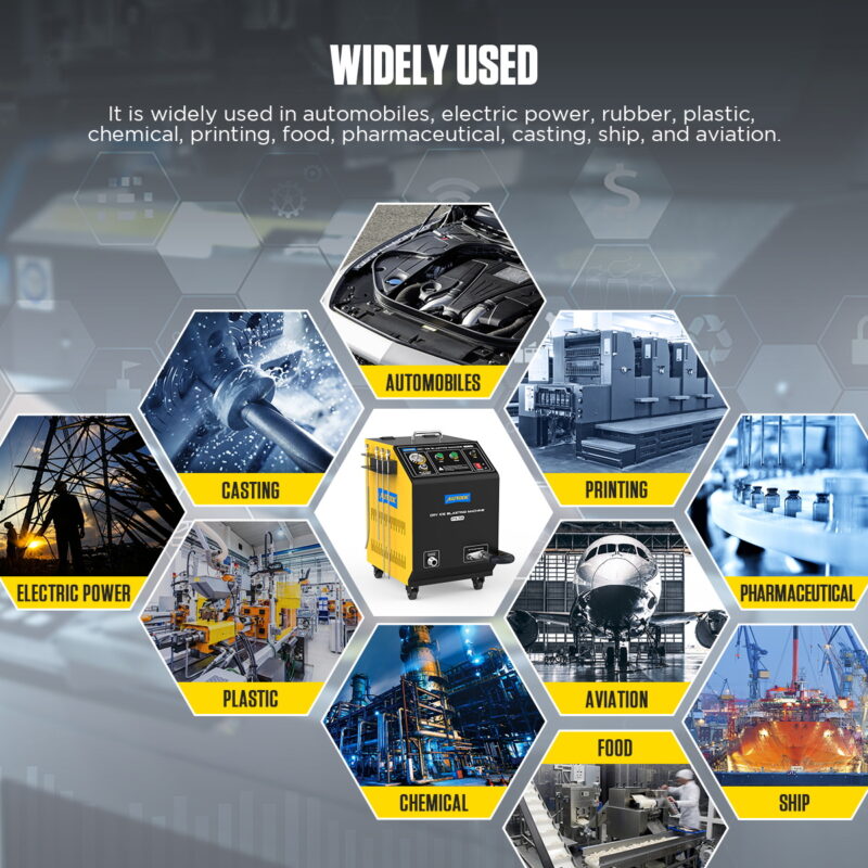 Αυτοκινητοβιομηχανία: Ακριβής αφαίρεση επικαθίσεων άνθρακα από βαλβίδες εισαγωγής, θαλάμους καύσης, κεφαλές εμβόλων και στροβιλοσυμπιεστές χωρίς πλήρη αποσυναρμολόγηση του κινητήρα. Ιδανικό για τον καθαρισμό κιβωτίων ταχυτήτων, στοιχείων ανάρτησης και χώρων κινητήρα χωρίς κίνδυνο για τα ευαίσθητα ηλεκτρονικά.